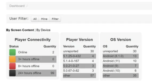 - Dashboard – this is aggregation showing your displays aggregated by status (connectivity), player app version and by operating system version (of the media player or the smart display).