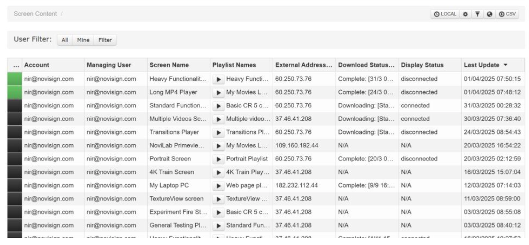 - Screen Content – this is your screen monitor which shows you the live status of all your displays in the last 24 hours (while all other reports will show what’s been going on in your displays beyond the last 24 hours). It is the most important tool in the reports module. Except filtering like any other report, you have a CSV export button (please remember that the exported CSV has much more data than what you see in the monitor, i.e. app version, OS type, OS version, etc.).